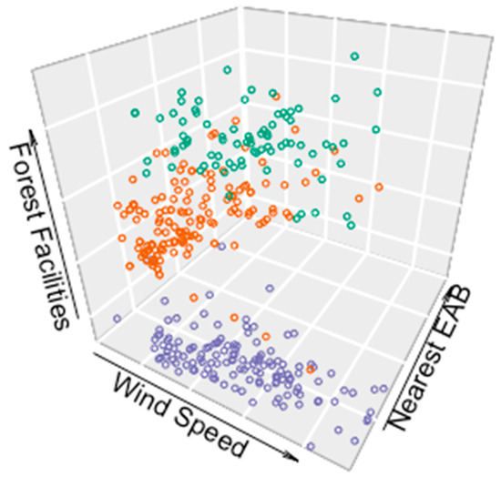 Spatial autocorrelation was evident in the risk predictors among the sampled data described above. As an example, a 3D scatter plot for three predictors (average wind speed in June, distance to the nearest EAB positive location, and distance to timber processing facilities) that correspond to three counties is shown in Figure 2. Three clusters are clearly evident. This suggests that the sampled points within a geographic neighboring area share similar features. The clusters for the counties of Kawartha Lakes and Lennox and Addington were closer together, due to their spatial proximity, compared with that of Waterloo County, shown at the bottom of the scatter plot.