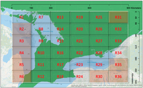 Study area partitioning. Sample locations are grouped into 36 regions to capture the random effects in the second model. Please note that there were no data in Regions R2, R3, R4, R5, R6, R30, R31, R35, and R36 and these regions were excluded from the model.