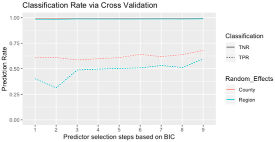 Modeling the random effects by county produced overall lower BIC values in comparison with the model with regional random effects (Table 5). This shows that the random effects with 46 spatial clusters provided a better overall fit for the EAB data than the other models. In addition, the cross-validation demonstrated consistent results as shown in Figure 4. Since the species data were unbalanced in terms of absence points abundance, the true negative rates of the validation data were close to 100% in all models. Meanwhile, the classification rates of the presence points were around 40% to 60% and, in general, the true positive rates agreed with the results from the stepwise model selection. The final step of the selection process provided seven predictors with the lowest BIC values and highest classification rates, which mainly consisted of climatic and anthropogenic factors, for model validation.