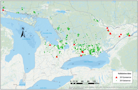 The presence–absence data of the EAB distribution from the year 2013 were used to test the proposed models. The samples consisted of 22 presence points and 876 absence points (Figure 5). The prediction results were provided based on the three models discussed in the previous section (Table 7). The GLMMs provided a better overall performance in comparison with the logistic regression model. In fact, the predictive accuracy was improved by 20%. Since the data were unbalanced with more absence than presence points from the species data, all models correctly classified the absence points in the testing data and produced high true negative rates (specificity) of approximately 99%.