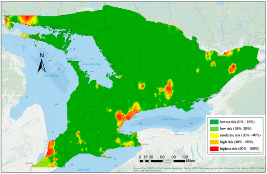 Projection of the risk map in southern Ontario. Predicted probabilities are based on the GLMM with regional random effect (Model 2 in Table 6).