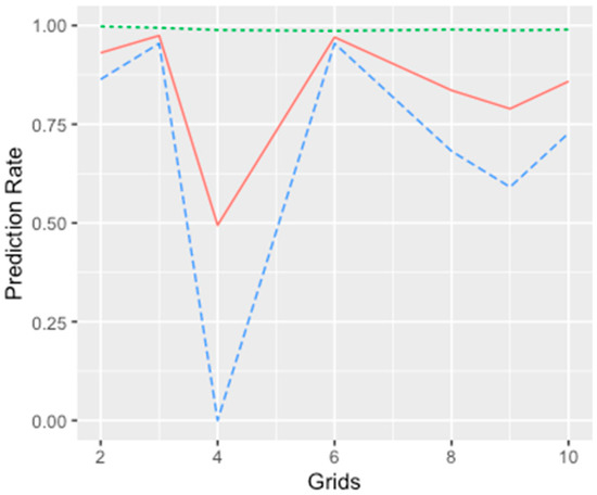 Experiments were carried out with different grid sizes (varying from 2 by 2 to 10 by 10 pixels). The prediction results of the GLMM with different sizes of regions are shown in Figure 7. Even although the overall accuracy did not vary by grid cell size, the rates for true negative and true positive results were dependent on how the random effects were characterized. Furthermore, it was shown that the grid size of 6 by 6 pixels used in this study generated the best accuracies. It is notable that regions with regular grid sizes were used. In future research, the random effects of the regional factor could be examined with different sizes, shapes, and geographic coverage within the study area. Data analysis could be carried out to cluster the data and the generated clusters could be considered as the units for GLMM modelling.