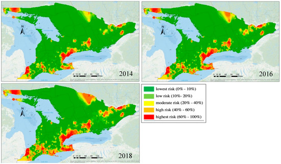 The GLMM with the regional random effect could be used to produce expected risk maps for future years for decision-making. For example, we simulated the spread of the EAB for 2014, 2016, and 2018 without any further mitigation measures and under the same environment, such as climatic factors etc. The predicted risk maps are shown in Figure 8. As participated, it was shown that the EAB infestation would be more severe without any mitigation measures. Spatially, the results indicate the regions where the expected risk level was the most for a given year. Such information can be used by municipalities in their decision-making for forest/tree management. It is important to note that we did not have EAB data in these three years to validate the results. However, the trends were consistent with the general spread of EAB reported in Ontario over this time period.