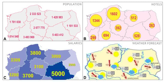 Visual variables can be used for numbers on a map, as well as for other map labels [,]. Quantitative characteristics are usually presented using size and lightness variables []. The diversification of the size of the numbers on a map, which is dependent on the value of the phenomenon, allows so-called proportional numbers to be created (Figure 1C) [], so that the map user may notice high values presented in the biggest font size more quickly and only afterwards register the smaller ones corresponding to lower data values. Proportional numbers can also complement a different form of presentation used on the same map (Figure 1C), one acting as a graphic-based legend. Numbers, both proportional and even-sized, may be used on a multi-variable map to present data different to those presented on the same map with the help of other methods (Figure 1D). Simple presentations (single-variable maps) (Figure 1A) are easier to understand than complex maps [], but these maps are meant to perform different functions. However, complex maps (Figure 1D) are a clue for a user that the combination of two or more phenomena on one map is not accidental, and when they interpret the map, they should draw conclusions based on the analysis of all of the presented information [].