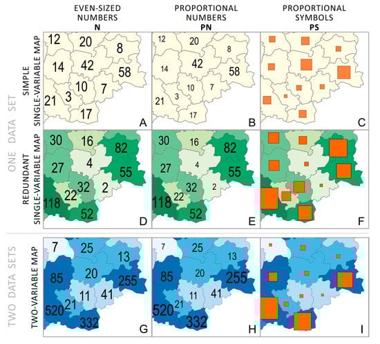 When the same data are presented on a map, not only as numbers but also using another cartographic method (e.g., proportional symbols as in Figure 1B or a choropleth map as in Figure 1C), these methods constitute redundancy. Redundancy is understood as “the unnecessary use of more than one word or phrase meaning the same thing” []. However, despite the fact that redundancy create additional visual load, it can also have a positive impact on the usability of the map [,,].