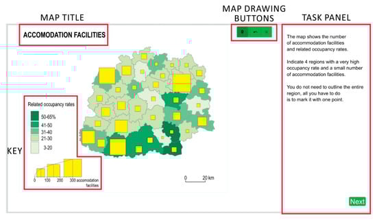 Users were surveyed with the help of desktop computers with internet access. The task and the map that participants used to solve the task were displayed on a computer screen (Figure 3). In the upper-right corner of the map window, there was a toolbar with drawing tools that users could use to respond to the tasks by selecting answers on the map.