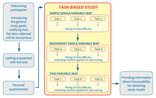 The study was preceded by a brief instruction session in which the study participants were informed that they were anonymously taking part in a study concerning thematic maps (Figure 4). They were asked to work independently. They were told how to mark their answers, that providing an answer was a condition for moving on to the next page, and that it was not possible to later return to a task already solved. After the instruction session, the study began. The first part consisted of a personal questionnaire with questions about the participants’ gender, age, and frequency of map use. Once they had completed the questionnaire, the participants proceeded to the main part of the study.