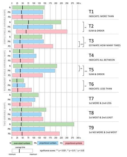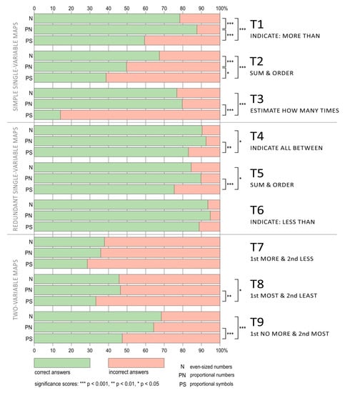 For each of the questions, the participants using proportional symbols had the lowest percentage of correct answers. There were statistically significant differences between the percentages of correct answers recorded for participants working with proportional symbols and those who used both types of numbers in the case of most tasks (except T6 and T7) (Table 3).