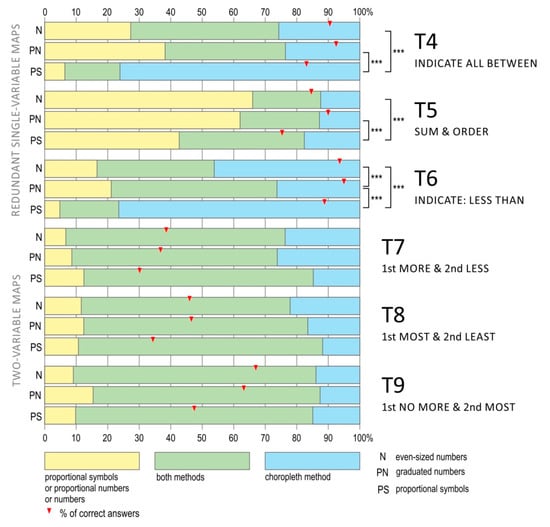 In the tasks with redundancy, the study participants were asked to indicate values from a specific range (T4 and T6) and to order the values of a given phenomenon (T5). In solving these tasks, the participants could not only search for numbers or observe circles of similar size but also make deductions based on the background, which indicated one specific degree of lightness, defined in the choropleth map legend as one class. The percentage of correct answers was very high: for both types of numbers, it was over 90%, and it was over 80% for proportional symbols. In this group of tasks, the differences between the methods in the individual pairs of compared techniques were less pronounced. Differences in the percentages of correct answers were statistically significant only between proportional numbers and proportional symbols, and between even-sized numbers and proportional symbols in tasks T4 and T5 (PN-PS: T4—Cramér’s V = 0.145, p < 0.01; T5—Cramér’s V = 0.190, p < 0.001; N-PS: T4—Cramér’s V = 0.108, p < 0.05; T5—Cramér’s V = 0.114, p < 0.05).