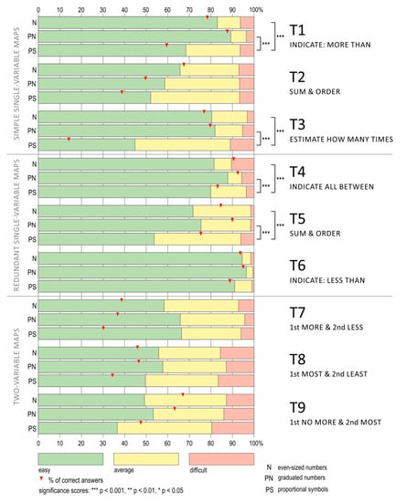 In the case of four tasks (T1, T3, T4, and T5), the differences in the assessment of the difficulty of the tasks involving proportional symbols and numbers were so clear that they were reflected by statistical significance (Table 6). These differences in assessment were always to the detriment of proportional symbols, which were considered to be more difficult. Statistical analysis did not show significant differences in the assessment of the difficulty of tasks in which even-sized and proportional numbers were used.