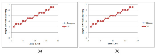 We also compare the actual statistical results of Geohash encoding length between the actual statistical and the corresponding latitude range in the four regions of Singapore, Hainan, Beijing and Heilongjiang when the zoom level is 1–18 show in Figure 8. The statistical result here is the result of the comparison with the screen coordinate position of the highest precision 14-byte Geohash encoding. The latitude ranges of the four areas are selected from the , and consistent with the calculation range. As can be seen from the Figure 8, the actual test results are consistent with the calculation results of the corresponding latitude range. Thus, when Geohash is used to represent the coordinate position of the geometric objects on the map, it is not necessary to use the 14-byte length but to select the appropriate length according to the latitude position and zoom level, which indicates that Geohash can realize multi-granularity data representation and data compression without loss of display effect. According to the results of our experiment, only 12 bytes Geohash is needed at most to meet all the experimental precision requirements.