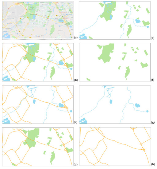 Example stimulus and experiment blocks: (a) original stimulus; (b) Block 1: all map elements; (c) Block 2: roads and hydrography; (d) Block 3: roads and green areas; (e) Block 4: green areas and hydrography; (f) Block 5: green areas; (g) Block 6: hydrography; (h) Block 7: roads (modified from [6]).