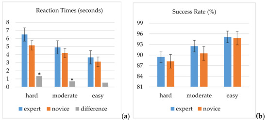 The overall average reaction time was 5.1 s (SD = 1.1) for experts and 3.7 s (SD = 0.5) for novices, consequently, experts spent more time than novices did for all tasks. For hard tasks, experts spent 6.9 s (SD = 1.4) whereas novices took 5.0 s (SD = 0.6); for moderate tasks, experts completed them in 5.4 s (SD = 1.4) while novices took 2.9 s (SD = 0.6); and lastly, for easy tasks, experts responded in 3.7 s (SD = 0.9) and novices took 2.8 s (SD = 0.4) (Figure 3a). These differences between the two groups were statistically significant across the hard and moderate tasks (Mann–Whitney U test: Uhard = 106.000, p = 0.022; Umoderate = 114.000, p = 0.035), however, it was not the case for easy tasks (Mann–Whitney U test: Ueasy = 128.000, p = 0.138).