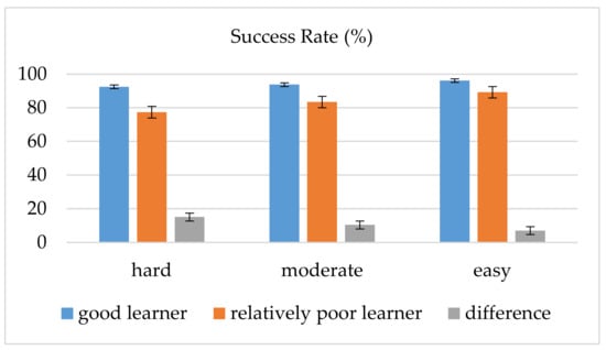 The overall average success rate for hard tasks were 88.7%, with the lowest score of 66.0% and the highest being 98.0%. Good learners averagely scored 92.5%, whereas the other group scored 77.4%. The overall average success rate for moderate tasks was 91.2%, with the lowest score of 74% and the highest being 98.0%. The average score of good learners was 93.7% and the relatively poor learners scored 83.4%. The overall average success rate for easy tasks was 94.4%, with the lowest score of 80.0% and the highest being 99.3%. Good learners resulted as 96.1% while the remaining group as 89.2%. The difference occurred between good learners and the relatively poor learners for easy tasks was 6.9%; for moderate ones, 10.3% and for hard ones, 15.1%. It is also important to mention that we observed an increase in terms of the performance differences between good learners and relatively poor learners as the task difficulty increases (Figure 4).