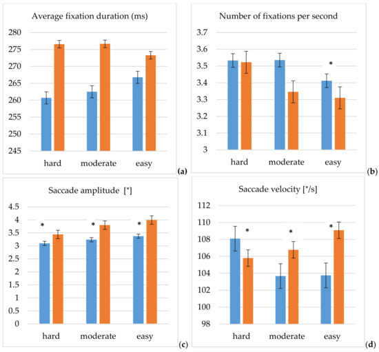 Next to the average fixation duration and the number of fixations per second, which were previously published in [6], we explored saccadic eye movements as measures of cognitive processing demands, i.e., cognitive load, because they are highly distinctive, task-dependent, and can be correlated with fixation duration, to interpret the overall cognitive load [19]. There is a strong evidence that longer fixation duration and shorter saccades are related to higher cognitive load [28] and indicate that more attentional resources were required [29]. Consequently, it is possible to formulate that fixation duration and saccade velocity increase, but saccade length decreases when information processing rises.