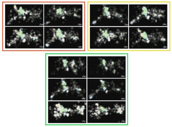 Focus maps belonging to the example stimulus in Figure 1. The maps in the red rectangle represent hard tasks: (1a) Block 1—experts, (1b) Block 1—novices, (2a) Block 2—experts, (2b) Block 2—novices. The maps in the yellow rectangle represent moderate tasks: (3a) Block 3—experts, (3b) Block 3—novices, (4a) Block 4—experts, (4b) Block 4—novices. The maps in the green rectangle represent easy tasks: (5a) Block 5—experts, (5b) Block 5—novices, (6a) Block 6—experts, (6b) Block 6—novices, (7a) Block 7—experts, (7b) Block 7—novices.