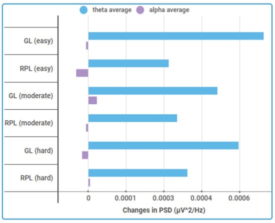 Changes in PSD of theta and alpha averaged for all tasks.