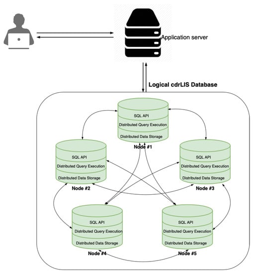 Figure 3 shows the simplified system architecture of our single-site distributed cdrLIS prototype. In line with the model driven architecture principles, we used YugabyteDB—a NewSQL distributed DBMS—and its object-relational model as a database platform-specific model. It is an open-source derivative of Google Spanner [35], designed for (i) horizontal scalability, (ii) strong consistency, and (iii) disaster resilience and built on top of a custom distributed key/value storage engine forked from RocksDB [49]. The cluster of five nodes functions as a highly available and resilient distributed database with fault tolerance factor = 2 (i.e., the system can tolerate two node failures; see Section 4.4), in which each node performs CRUD operations. In our case, nodes are commodity physical machines running the Linux operating system, but they also could be virtual machines or containers.