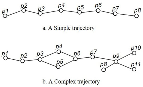 The periodic pattern of a trajectory could be defined as cycle of the behaviors of an object that is moving at a regular time interval at specific locations [1]. The periodic patterns can show the repetitive behaviors of a moving object and can be used to predict future events [2,3,4]. However, the existing research of trajectory periodic pattern mining mainly focuses on a simple trajectory with a linear structure, such as people, animals, vehicles and so on (Figure 1a). Today, high quality spatial data (including satellite observation data, field observation data, and model outputs) make it possible to reconstruct and study the complex trajectories of objects that split and/or merge while they are moving around [5,6,7] (Figure 1b). Moreover, there is a glaring lack of pattern mining methods that could be applied to complex trajectories and most existing pattern mining methods are for simple trajectories. Therefore, this paper mainly studies the complex trajectories periodic pattern mining problem.