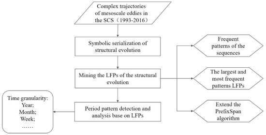 In this paper, we proposed a periodic pattern mining of structural evolution (PPSE) method to extract periodic patterns from complex trajectories. The method is developed based on the frequent sequence pattern mining algorithm PrefixSpan [10] and it fully considers complex trajectories’ spatiotemporal characteristics and their topological structures. It first transforms a complex trajectory into a symbol sequence, which represents the evolution of topological structures. The PrefixSpan algorithm was then expanded and used to identify the largest and most frequent sequence patterns (LFPs) from the structural evolution sequences. The potential yearly, monthly, and/or weekly periodic patterns were then identified from the LFPs. In the end, we applied the PPSE method to examine the complex trajectories of mesoscale eddies in the SCS from 1993 to 2016 and identified their frequent periodic patterns.