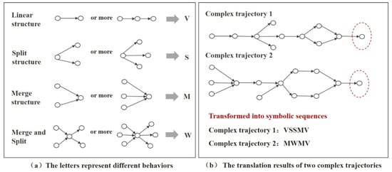 The types of trajectory points (splitting, merging, merging and splitting) mark the structural changes along a complex trajectory. Accordingly, we can translate a complex trajectory into a sequence of symbols, each of which represents an eddy’s specific behavior/stage over its evolution process (Figure 3). Specifically, the letter v was used to represent a linear structure in which all points are not involved in any splitting or merging events. The letter s was used to represent a splitting structure in which an eddy splits into two or even more structures. The letter m was used to represent a merging structure in which two or more eddies merge. Lastly, the letter w was used to represent a structure in which multiple points join together and then split right away.
