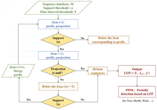 Like the PrefixSpan, the PPSE also constructs a projection library of frequent sequences. However, the PPSE sets up a time threshold T and two sequences are paired and compared only when their timing difference is less than the pre-set threshold. The threshold T could be any time granularity. Figure 4 shows how the PPSE was used to identify the LFPs and the major steps are elaborated upon below.