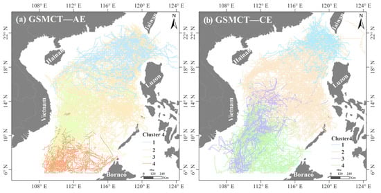 Clustering results of complex trajectories of anticyclonic eddies (AE) (a) and cyclonic eddies (CE) (b) in the South China Sea (SCS) using the global similarity measuring algorithm for complex trajectories (GSMCT) proposed by Wang et al. [31].