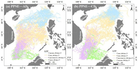 Very similar LFPs were found for the four AE(a) and CE(b) clusters (Figure 6). On average, more than 60% of the complex AE and CE trajectories are dominated by the merge structural change in the northern (orange trajectories), the central (blue trajectories) and the southern (green trajectories) SCS. These LFPs (LFP 1, LFP 2, LFP 3) have a 60- or 90-day activity period of structural changes.