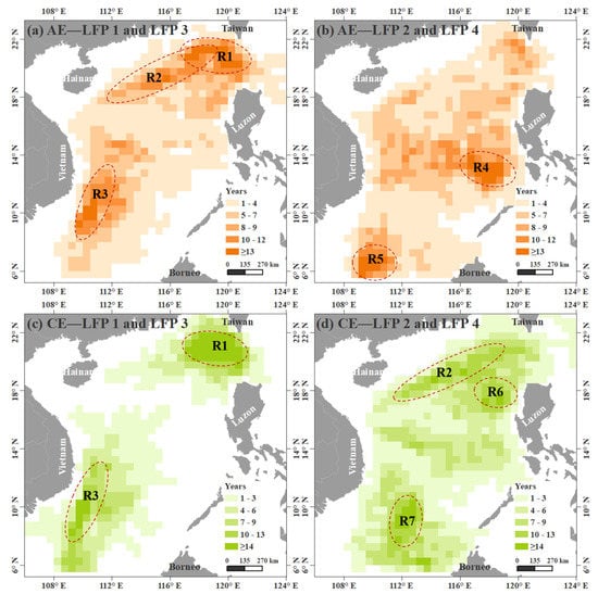 Figure 8 shows the interannual migration channels of AE and CE LFPs per 0.5° × 0.5° (about 55km x 55km), which is close to the migration range of eddies in the SCS [28]. The number of years per grid refers to the different years when the trajectories appear in that grid. The oval regions represent the migration channels (R1-R7) that are close to the LFPs with significant interannual periodic pattern (17–24 years, accounting for 70–100% of the 24 years). Table 2 shows the statistical characteristics of these channels.
