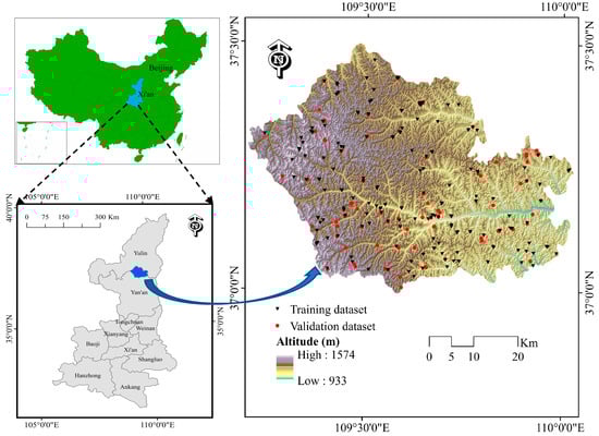 Landslide inventory and mapping is the foundation of landslide susceptibility mapping. In this study, the landslide survey data come from the following three methods: consulting the geological report of the study area; conducting a field survey with the help of the global positioning system (GPS); analyzing remote sensing images [38]. Finally, 263 landslides were identified in the study area, as shown in Figure 1. Rainfall and human engineering activities (engineering construction, urban construction and construction of highways and railways, etc.) are the main triggers of landslides [39], and loess landslide is the dominant type of landslide in the study area. Based on the analysis under GIS environment, the largest landslide in the study area is greater than 1 × 107 m3, and the smallest landslide is close to 120 m3. Each landslide polygon in the data set was expressed using the centroid. Furthermore, it is necessary to randomly select the same number of non-landslide points in the study area—defining 263 landslide pixels as “1”, and then defining 263 non-landslide pixels as “0”. In this study, the original data were randomly divided into training data set and validation data set with the ratio of 70/30, because today there is no uniform specification for the division of the data set in LSM [1,40].