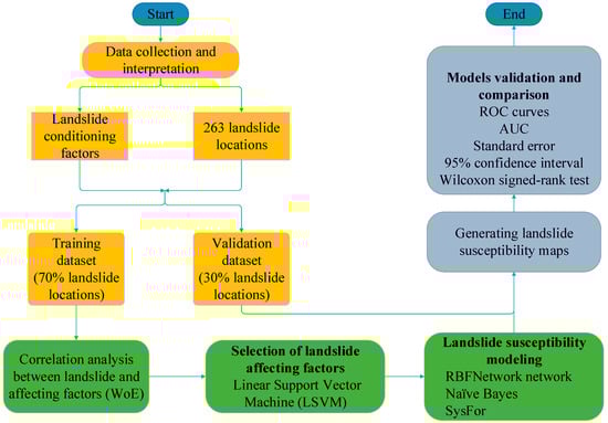 The research method used in this paper can be divided into the following steps, as shown in Figure 2: (i) data collection; (ii) preparing the landslide conditioning factors and determining the landslide location; (iii) correlation analysis between landslide and affecting factors (WoE); (iv) selection of landslide affecting factors using the Linear Support Vector Machine (LSVM); (v) RBFN, NB and SF models are applied to assess landslide susceptibility in the study area; (vi) model validation and comparison; (vii) generating landslide susceptibility maps.
