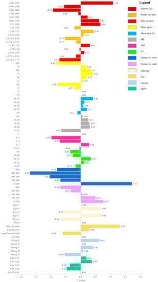 In this paper, the WoE model is used to analyze the correlation between landslide occurrence and affecting factors, as shown in Figure 3. The overall spatial correlation between the predictable variable and the landslide can be reflected by C. WoE results analysis, which showed that the correlation with the landslide decreased with the increase in elevation. An increase in altitude is accompanied by an increase in precipitation, a decrease in temperature, and accelerated weathering, thereby promoting the occurrence of landslides [75]. Therefore, an altitude >1500m had the highest correlation compared with other elevation ranges. In terms of profile curvature, it was only positively correlated with the occurrence of landslides at (−0.46 to 0.58) and (0.58–1.97), and 42% and 29% of landslides occurred at the two profile curvature points. The plan curvature is positively correlated with the occurrence of landslides in the range from (−0.54) to 0.38 and from 1.44 to 7.56, and negatively correlated in other ranges. Both the profile curvature and the plan curvature control the speed of flowing water affect the degree of slope erosion [76]. If the slope direction is different, then the slope surface is different from the sun exposure and rainfall erosion, resulting in different slope materials [50]. In the southern part, 15% of landslides occur, and the correlation is highest in this orientation with landslides. When the slope is <10° or >50°, the occurrence of the landslide is randomly distributed; the correlation with the landslide is the highest in the range of 10–20, and 30% of the landslides occur in this range, meaning that this affecting factor has a high incidence of landslides in this range. The SPI value has the highest correlation, with an occurrence of landslides in the range of 10–20.