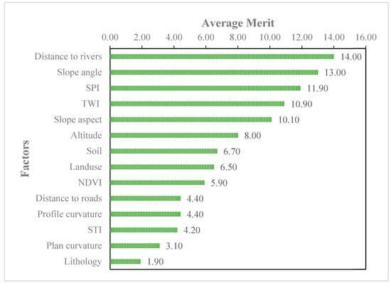 The prediction ability evaluation and comparison of 14 landslide impact factors show that, although the contribution of each factor is different, they contribute to landslide prediction modelling, as shown in Figure 4. The result shows that distance to rivers has the highest predictive capability (14), followed by slope angle (13), SPI (11.9), TWI (10.9), slope aspect (10.1), altitude (8), soil (6.7), land-use (6.5), NDVI (5.9), distance to roads (4.4), profile curvature (4.4), STI (4.2), plan curvature (3.1) and lithology (1.9). Therefore, all 14 affecting factors were selected for the models.