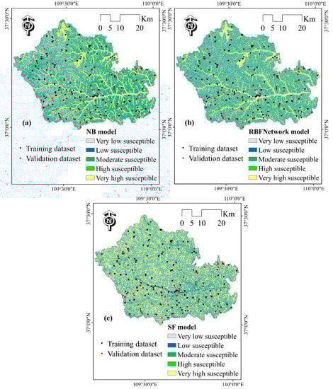 Landslide susceptibility maps: (a) naïve Bayesian (NB) model; (b) RBFNetwork model; (c) SysFor (SF) model.