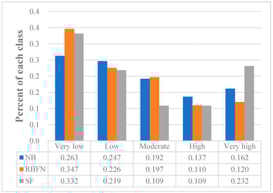 Generating the landslide susceptibility map generally requires the following two steps [38]: first, obtain the landslide susceptibility index (LSI) of all the evaluation units; then reorganize the LSI obtained in the first step. The specific operation is to calculate the LSI of each evaluation unit by using the probability distribution function of the evaluation model and then re-divide the obtained LSI by the natural discontinuous point grading method in the ArcGIS software. In this study, NB, RBFNetwork and Sysfor models generated three landslide susceptibility maps, as shown in Figure 5. Figure 5a is the landslide susceptibility mapping generated by the NB model. The LSI is divided into five ranges of 0–0.133, 0.133–0.322, 0.322–0.537, 0.537–0.769, and 0.769–1. Figure 6 shows that the very low level has the largest area.