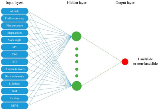 Figure 5b is the landslide susceptibility mapping generated by the RBFNetwork model, and the landslide susceptibility categories were also divided into five categories. The LSI is divided into five ranges of 0.203–0.288, 0.288–0.407, 0.407–0.543, 0.543–0.721 and 0.721–0.88, as shown in Figure 6. In this study, the structure of the network consists of three layers: an input layer of 14 neurons; a hidden layer (called an RBF unit); an output layer containing a neuron, as shown in Figure 7. The learning process of the RBFNetwork can be divided into two parts: (a) using the K-means algorithm to calculate the number of clusters (hidden neurons); (b) the optimal estimation of kernel parameters [1].