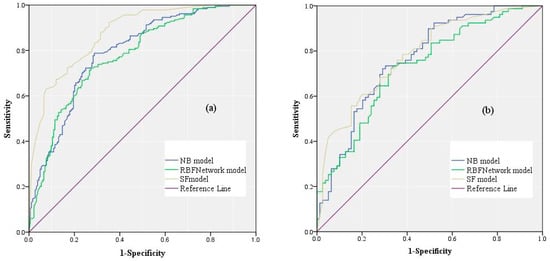 ROC curves of the models: (a) training dataset, (b) validation dataset.