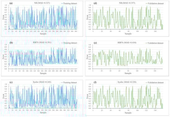 Modeling error in the training (a–c) and validation (d–f) datasets.