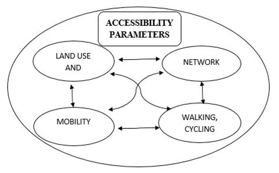 There are various approaches for achieving sustainable urban development through a city’s form. One of the key aspects of sustainability focused on nowadays is accessibility, namely how accessible green spaces, jobs and services are to communities and how interconnected they are with walking and cycling facilities [24]. Accessibility mostly depends on density and transport linkages, which in turn depend on land use distribution [25]. It is necessary to develop accessibility for reasonable walking distance in cities of developing countries, because of a high level of mixed-use development patterns [26]. Cities which are well designed allow people to have high levels of access to services and facilities, encouraging proximity and social interactions. This permits a range of public transport services and is less consumptive in terms of resource use per person [27]. Evidence shows that better access to services by feasible public transport has a less negative impact on the environment [3]. Therefore, the availability of public transport must be made close to the activities, whereby accessing them becomes much easier [28]. Many cities concentrate on improving access to PT, which often involves some walking or cycling interventions to connect from the origin to destination of the trip, and this leads to improved last-mile connectivity [29]. It interlinks the accessibility of one parameter to another, as shown in Figure 1, for example improving accessibility towards walking and cycling to provide more local access. It will have a direct impact on public transport’s access and indirectly affects commuting distance for jobs, services, and recreation and health facilities. Overall, it requires policies for improving mobility with mode, road and pathway network, design and encouraging non-motorized vehicles in an urban area.