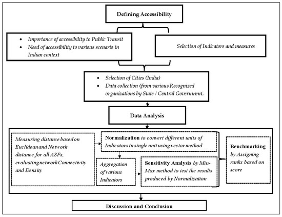 This paper is organized into six parts—introduction, literature review, case selection and data collection, data analysis, results, discussions, and conclusions. The introduction presents the importance of accessibility planning and factors influencing accessibility. It further states the need to conduct the study in Indian cities for measuring accessibility, particularly to ASFs from PT. The second section describes the literature review by identifying various measures of accessibility with reference to cases of developed nations, which helps in the selection of indicators. The third section elaborates on the selection of cities and data collection. The fourth section presents the data analysis based on parameters including a data quality check, measuring accessibility by distance measures, detour index, normalization, etc. In the fifth and sixth sections, the results are presented, followed by a detailed discussion on the output of study. The last section makes the concluding remarks for the study.