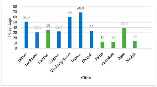 For the current study, large cities with a population of over 3.1 million were ignored, as these cities exhibit unique characteristics in comparison with the million-plus cities in India. Moreover, limited studies were conducted for the shortlisted cities, on the accessibility of PT (PT in this study considers only bus stops). Therefore, confining this scope, the present study attempts to assess the accessibility to various ASFs from bus stops at the city level. All these cities were shortlisted based on population size and presence of a public transportation facility in the city as shown in Figure 4. For this paper, out of the 11 shortlisted cities, only 6 were considered (Visakhapatnam, Nagpur, Bhopal, Jaipur, Lucknow, and Indore), as shown in Figure 4 with blue colour bar, and they are mapped accordingly in Figure 5.