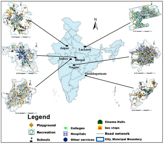 Previous investigations of several studies of accessibility using geographical information system GIS were conducted at the city level, associated were dealing with accessibility to jobs, connections using public transport, reaching the nearest transit from workplace [15,16,17]. But the focus on other amenities and services connecting to PT is very rare at the city level—these studies have so far focused on the neighborhood-level [18]. Only a few studies have been conducted at the city level, such as the one conducted in Pune metropolitan area in India, which revealed that 41% of school children do not have access to public transit [19]. Many students in India are restricted to their society schools because of inadequate PT services in some parts of the city, as lower-income families cannot afford private transport modes to reach schools at a far distance [20]. Implementing geospatial technologies towards health access in numerous developed nations has become widespread, but the use of these approaches in India has been fairly slow [21]. Only a small amount of research has been carried out in spatially connecting access to health care infrastructure with residents and the road network in India [22].