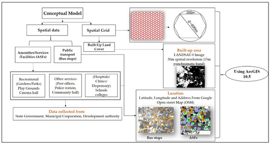 Secondary and spatial data were collected from various sources, as shown in Table A1 in Appendix A. Data are mapped using OpenStreetMap (OSM) in Google Earth (GE) and imported into ArcGIS 10.5.1 for analysis, as shown in Figure 6. For built-up area, the Landsat 8 image of datum WGS84 was used shown in Table 6. Bands 4, 3 and 2 were combined to create true-colour composite images. For analyzing the land cover, supervised classification was performed by a pixel-based supervised classifier, in which other land covers such as forest, agriculture, and water bodies were excluded from this study and only built-up area was delineated and used. The data from OSM in GE were overlapped with built-up area, as accessibility is crucial for identifying geo-located features and labels. The combination of earth observations with OSM features is a tool for large maps and offers significant opportunities for the creation of ideas [81].