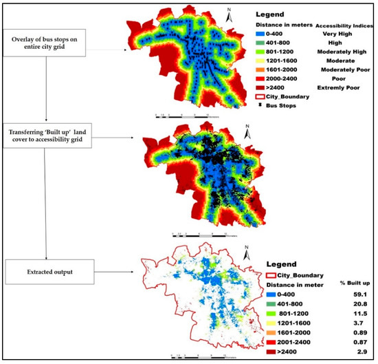 There are many methods to measure cities’ accessibility, but they cannot be generalized for all cities and towns around the world, since accessibility is affected by the local network, data quality and local context [23]. An alternative approach is needed to tackle unique and specific issues concerning settlements in India. Accessibility is well established at the neighborhood scale, but often a city is not a homogeneous entity in terms of dynamics, considering land-use patterns and network. In this study, a comprehensive cumulative accessibility score and index of cities is conducted. Additionally, spatial mapping of the city network and built-up area is taken into consideration, along with discrete interventions.
