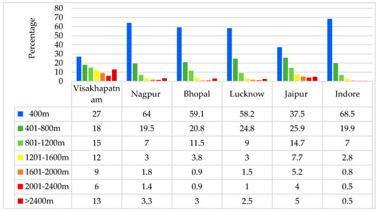 Euclidean distance accessibility levels are considered up to 2400 m; above this range of distance, bus stop facilities are considered not available. Initially, the distance from the bus stop is measured to the nearest ASFs. For example, in Figure 9, for hospitals and clinics, the distance is measured from the bus stops. Depending on the range of distance, every hospital and clinic will be designated a color and symbol, intersecting the built-up area with the same colour (Figure 7). Similarly, this process is repeated for the remaining sectors of ASFs in all the six cities. As all the ASFs are represented as a point, moreover for recreation and playgrounds the points are considered at the entrance. Here, the ASFs percentage for very high access range (0–400 m) is shown in Table 7, and the total percentage of ASFs combined (average of recreational places, playgrounds, cinema halls, other services, hospitals and clinics, schools and colleges), noted for Euclidean distance for entire range (0–2400 m) in all the six cities, is shown Table 8.