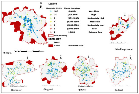 Spatial evaluation of hospitals and clinics from bus stops using Euclidean distance in six Indian cities.
