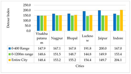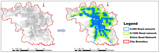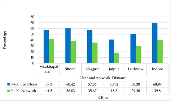 In all the cases of Table 8 and Table 10 for Euclidean and network distance, it is observed that over 68% of ASFs are in the moderately high level of accessibility. Thus, network connectivity and density have been examined for the very high accessibility range 0–400 m and moderate-high range 0–1200 m. The entire city network is examined to identify the network condition affecting the percentage of accessibility.
