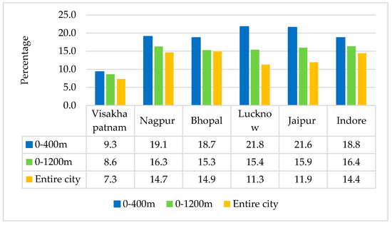 Previously in India, studies conducted at city level focused on accessibility assessment to jobs through public transport. These studies are mostly conducted in tier-1 cities, or cities with a population over 3 million as per the 2011 census, such as Mumbai, Delhi, Kolkata, Chennai, Hyderabad, Bengaluru, Ahmedabad, Surat, and Pune. Only a limited number of studies have focused on issues of access by walking to public transit at the city level to educational facilities [70,76]. However, these studies were limited for tier-2 cities. Most of the Indian tier-2 cities with a population of 1.5 to 3.0 million have an average trip length of less than 6km and the urban radius (which is determined as population distribution by distance from the center of the city) is within 15 km from the center, as shown in Figure 3a,b [77,78].
