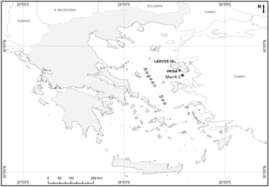 Simplified map of Greece presenting the location of Lesvos island, the Vrisa traditional settlement and the 12th of June 2017 (Mw 6.3) earthquake epicenter.