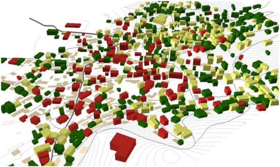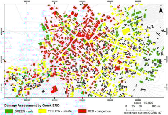 As far as the impact to the built environment of the Vrisa traditional settlement is concerned, shortly after the earthquake, the local Earthquake Rehabilitation Organization (ERO) performed the first and second order visual inspections, where 815 buildings were distinguished into “Green—safe for use”, “Yellow—unsafe for use”, and “Red—dangerous for use”, based on the Earthquake Planning and Protection Organization (EPPO) guidelines [39], and were marked with the appropriate sign based on this damage assessment, as shown in Figure 2. According to the legislation, buildings marked Red should be demolished soon by their owners, while the Yellow and Green ones should be repaired. Practically, several Yellow-marked buildings may also be demolished by their owners, since the cost for their reconstruction is very high. It should be noticed that, according to the legislation and for the purpose of this paper, demolishing a building also includes the transferring of the debris.